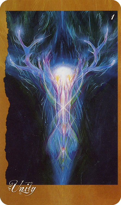 Looking at this of Unity, one observer notes, "All the power is focused in here, vast energies. It is as if all that power is looking for a place to happen." This is exactly what is going on. Unity is the energy of the cosmos still unmanifest, still without form. Here we see the dark and the light, masculine and feminine, active and passive, and other polarities, all expressed in balanced, energy-filled, vibrant union. "All That Is is one, and that One is god/dess" is the principle expressed. From this, all else derives. This is the source from which we draw not only our strength, but our very being.