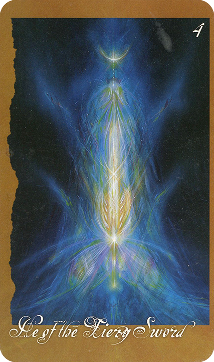 When looking at this card, my neighbor saw it not as a sword but as a feather of light. He saw it as a symbol of the ability to fly, to rise above things. An Oracle group member saw it as someone reaching up, ascending, surrounded by multiple reflections, and filled with light and power.